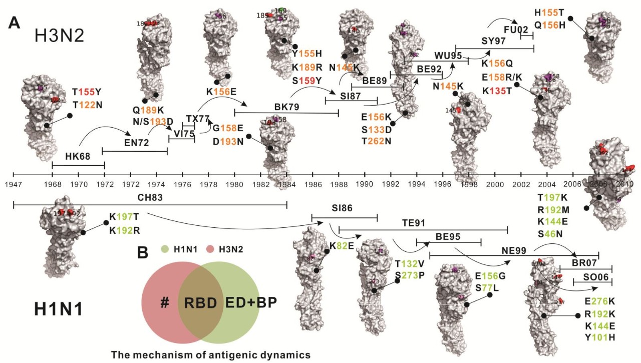 研究發(fā)現(xiàn),流感病毒A(H3N2)的抗原類替換決定性位點(diǎn)主要分布在HA蛋白的受體結(jié)合區(qū)(RBD)附近,而A(H1N1)除了分布在RBD區(qū)外,還分布在另外一個(gè)殘留酯酶區(qū)域(ED),這表明兩種亞型病毒既采用了一致的突變策略,又有自身特異性的變異機(jī)制。這也一定程度上給出了為什么甲型H3N2病毒抗原變異快而甲型H1N1病毒抗原變異相對(duì)較慢的原因。