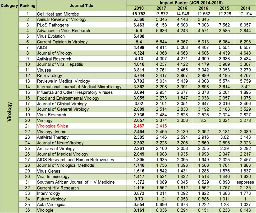 根據(jù)JCR的分類病毒學(xué)學(xué)科下共計(jì)收錄36種雜志,不包括分類在微生物學(xué)科下的一些綜合性期刊,如Nature?Microbiology、mBio等近年表現(xiàn)不錯(cuò)的雜志。