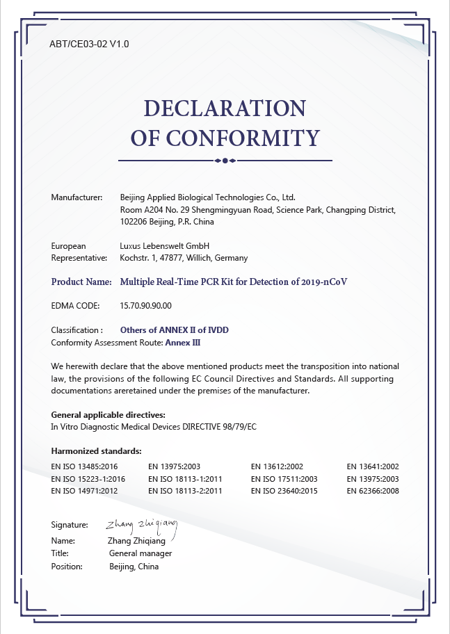 2020年2月27日,北京卓誠(chéng)惠生生物科技股份有限公司與中國(guó)醫(yī)學(xué)科學(xué)院病原生物學(xué)研究所聯(lián)合研發(fā)的新型冠狀病毒2019-nCoV核酸檢測(cè)試劑盒(熒光PCR法)【國(guó)械注準(zhǔn)20203400179】獲得國(guó)家藥品監(jiān)督管理局頒布的醫(yī)療器械注冊(cè)證。目前該產(chǎn)品已完成歐盟地區(qū)準(zhǔn)入,可向歐盟市場(chǎng)供應(yīng)。