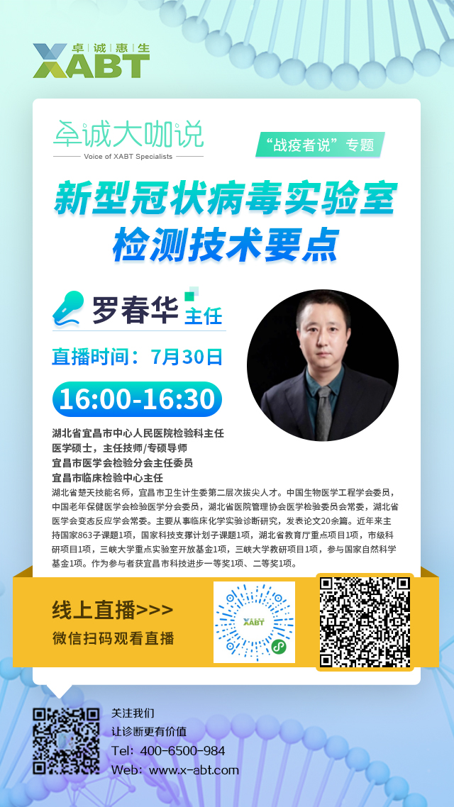 卓誠大咖說之“戰(zhàn)疫者說”專題第四期將于7月30日16:00正式開播,我們非常榮幸邀請到湖北省宜昌市中心人民醫(yī)院檢驗科羅春華主任為我們帶來《新型冠狀病毒實驗室檢測技術(shù)要點》的主題講座,期待各位屆時蒞臨直播間,共同學(xué)習(xí),互相啟發(fā)!
